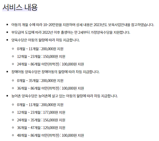 - 부모급여 도입에 따라 만 2세부터 가정양육수당을 지원
