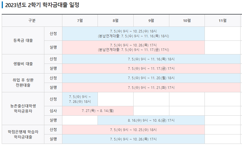 2023년도 2학기 학자금대출 일정은 아래 표와 같습니다.