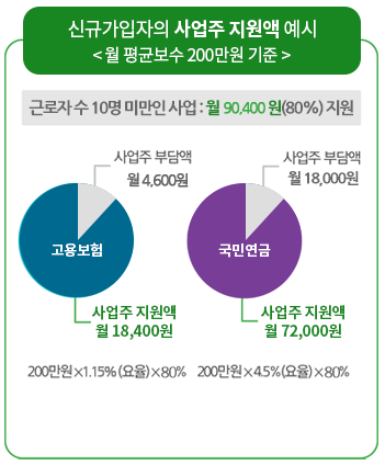 근로자 수 10명 미만인 사업에 고용된 근로자의 월평균보수가 200만원이라면 매월 90,400원을 지원 (80% 지원)